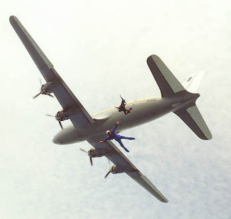 This immaculate plane is a C-54G (N51802 c/n35930) , then owned and flown by Jim Blumenthal. The event was the August 2000 World Free fall Convention held in Quincy Illinois. Mark Meltzer (me) is the jumper in blue. Photo by Steve Crane who has given permission for its non profit use as long as he is given credit as the photographer. |
