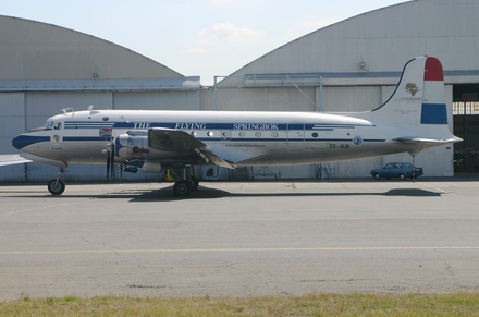 ![]() Later it flew with Aero Air (also as ZS-AUA), but I have little on its history until 1995 when it was registered as ZS-NUR, preparing for a new lease on life. That same year it was bought by the Dutch Dakota Association and arrived at Amsterdam Int'l Airport-Schiphol on May 05th 1996. It was reregistered PH-DDS in December and was expected to join the airshow circuit in Europe. Changing regulations by the Dutch Government prevented success in this endeavour. The extra (costly !) provisions needed for the restorations of the DC-3s and this DC-4 plus the restricted commercial use as result of the new rules by the Dutch RLD (CAA), forced the DDA to get rid of PH-DDS. It was removed from the Dutch Register on 14 Mar02 and was ferried by Springbok Flying Safaris, as ZS-AUA, to Germany and later all the way to South Africa. For more on that parting date, 03Nov02, have a look at DDA's DC-4 Departure ! Actually, ZS-AUA is on a lease from DDA Classic Airlines, with a monthly leaseprice of 2500 euro (as was revealed in an interview by Gerard van Putten of Anne Cor Groeneveld, chairman of DDA Classic Airlines, on the occasion of 25th anniversary of the DDA in March 2007).