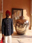 | 'Gangajalis' are the largest silver objects in the world as per the entry in the Guinness Book of World Records. They were made in the Mistri Khana (one of the 36 karkhanas of Jaipur State), the City palace, Jaipur by two silversmiths Govind Ram and Madhav. I found it more interesting that these jars were used by Maharaja Sawai Madho Singh II on his voyage to England, to attend the coronation of Edward VII, in 1902; the Maharaja did not trust the English water and had these jars filled with water from the Ganges. |