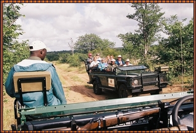A good view of the landrover set up, with Oscar, our tracker, in plain view.Our landrover could accommodate 10 passengers, but most times we were with 6 onboard. The Gomo Gomo Lodge was able to bring 3 landrovers into the field, but there were guests for only 2. We had selected the low-season for this purpose too, much less crowded and excellent weather nevertheless (at least by European standards, locals complained about the cold and wore sweathers). The roads in the park vary in quality, some are rocky and very bumpy. But the Ranger drove his landrover expertly and negotiated rivers and streams with great confidence. When there was occasion to leave the roads, the landrovers conquered all and everything, it seemed only to be limited by the comfort of its passengers. During the drives communication by radio was kept open with drivers of other lodges too, sharing the sightings. Some 6-8 units were in the field during most gamedrives. |