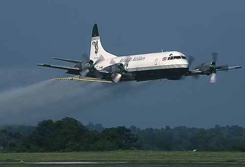 Lockheed L.188CF Electra G-LOFE (c/n 1144) is seen here on a demonstration of oil pollution dispersal. It was a very impressive performance, coming in only a few feet over the threshold.