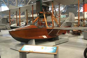 The Curtiss Seagull appeared shortly after the end of World War I. Although it was probably the best small flying boat of the period, not many were sold. The Seagull had to compete with the low-priced, war-surplus Curtiss MF flying boats from which it had been developed. With its wooden hull, pusher engine, and fabric-covered wings, the Seagull was typical of the flying boats of the period. The hull was constructed of mahogany plywood veneer over a wood frame and could accommodate three people. |