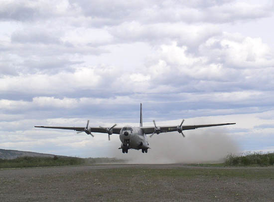 Arriving with its load at Umiat,AK: the landing on the gravel runway sends up billowing clouds of dust.