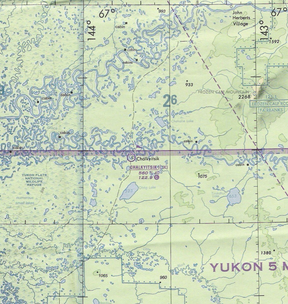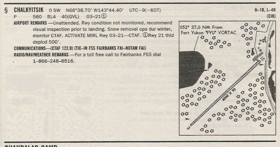 Chalkyitsik is a 5,000’x60’ gravel runway with virtually no ramp area. Population, 65. It is located some 150 miles north of Fairbanks.