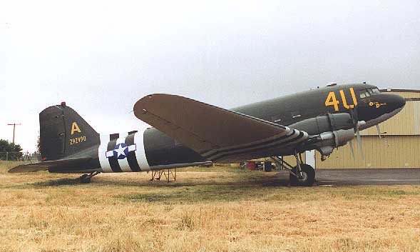 She had been inoperative in Richmond,IN for a few years. In 2002 she was put into flyable condition and ferry flown to Riverside, CA. We have gone through a full and complete restoration, dressing her exactly as the C-47s and C-53s looked on D-Day 1944. She will be back in the air within the next 60 days and on air show tour starting this year. For additional info please visit our website www.inlandempirecaf.com.