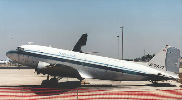 This C-47 started its career in the USAAF in 1942. It continued as NC54088 with National Air Produce in 1946, one of so many ex/military C-47s to find a commercial second life. It operated for Pressed Steel Car Corp. (N77C) and various other US companies. In 1963 it went abroad to LADECO in Chile (CC-CAO), but returned to the US in the 1970s (N783V). I photographed it in 1999, while stored at Opa Locka,FL without props. It still carried the scars of damage by storms in 1998.
