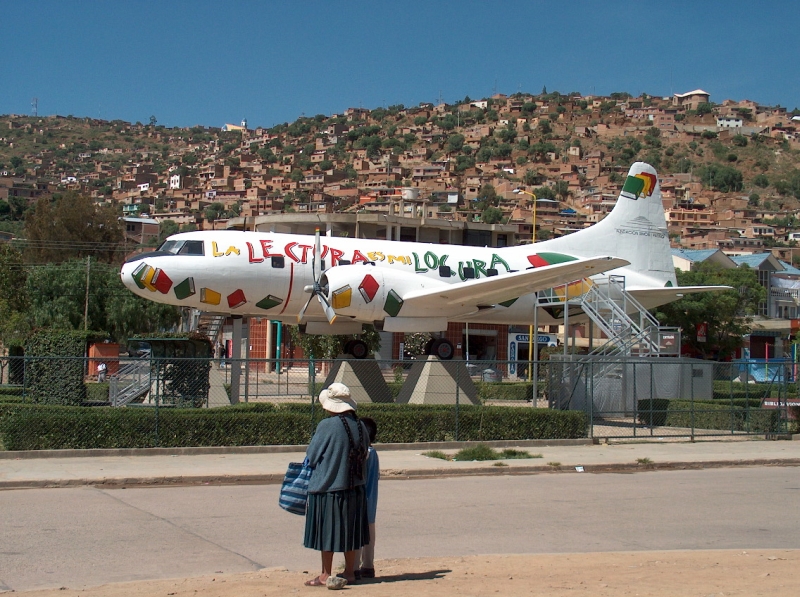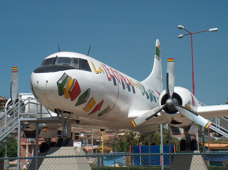 Michael Prophet photographed this B-25J Mitchell bomber in March 2006 and provided the following information: FAB542, static display since 1983, ex Fuerza Aerea Boliviano; parked on Plaza Cap W Arce, Cochabamba,Bolivia. Photos © Michael S. Prophet. This is truly one that could be overlooked but is worth the detour: Convair T-29 / C-131, ex CP-1356 Frigorifico Reyes (c/n 329). This aircraft is now used as a children's library; it is parked on Ave 6 de Agosto, Cochabamba,Bolivia. Photos © M.S.Prophet (March 2006). |