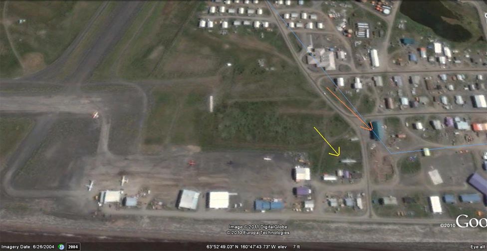 The yellow arrow points to the C-97 hulk, and the orange arrow points to the green roofed building you can see in the closeup photo on your webpage.