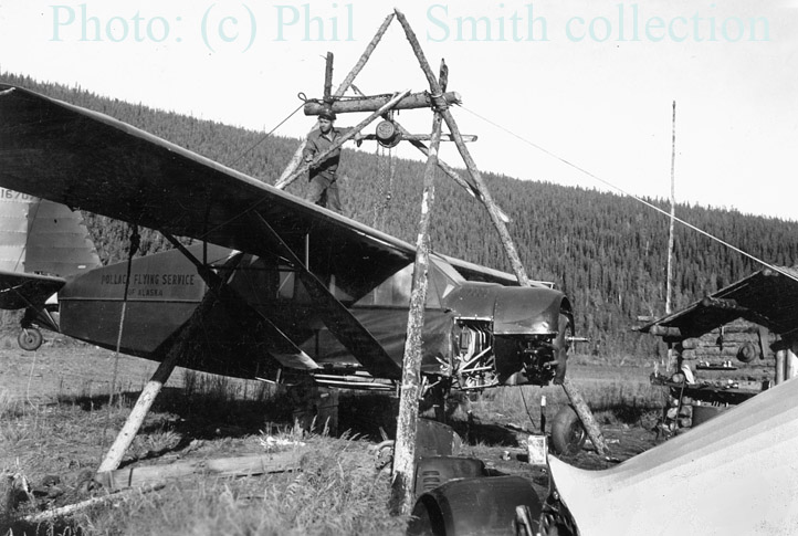 Bill Bailey came up with the correct tailnumber: "Phil Smiths' NC 211 is a Stinson SR-10F and the full registration was NC 21111. The last two digits ( 11 ) are hidden behind the branch... There is a picture of it on floats in Vol.7 Of Jos.P. Juptners US Civil Aircraft Series (page 295)." Pacific Alaska Airways became the Alaska Division of Pan American Airways in 1941. I would welcome more details of this crash or what became of NC21111: it was salvaged, as we can see on the photo below. |