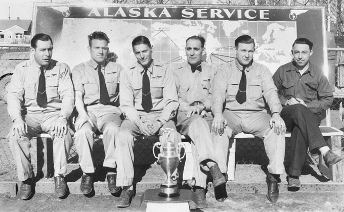 ![]() "The PAA guys received a trophy for service; note the woman reaching down to hold the world, on top of the trophy - or that could be a bowling league trophy...? My dad is on the left. Left to right no.5 is Ray Robinson, who is the other guy with my dad in those pictures where they have a firepot under a plane engine to warm it up." |