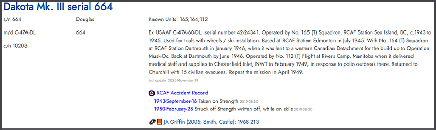 W92 31.65 Peter C. Hill wrote me in April 2026 his results of fine research (a modern explorer!): Douglas C-47B C-FBKX (c/n 32813/16065) crashlanded 15Feb83 while on take off from Gillam-Shamattawa, 1 engine failed while at 700ft, unable to keep the overloaded aircraft airborne... |