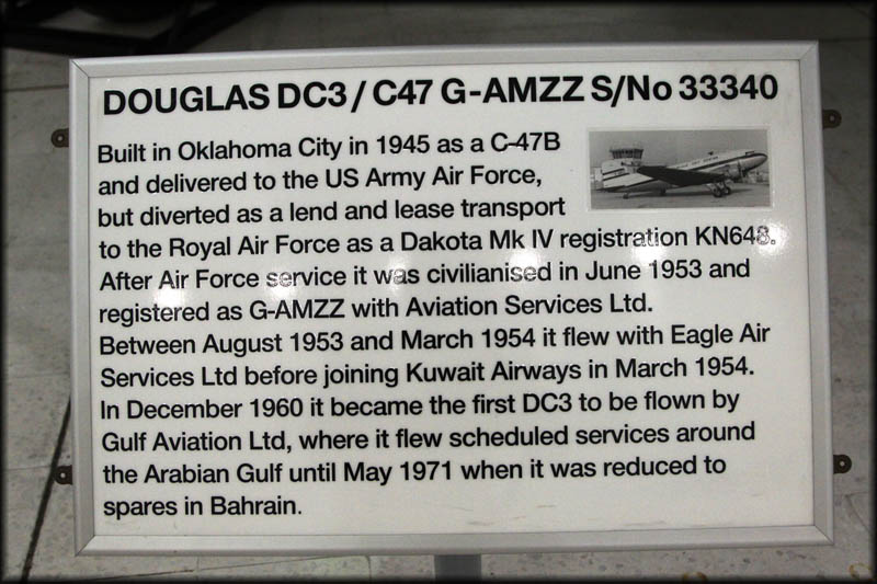 Delivered 22May45 as 42-77008, reregistered KN648 RAF Montreal 23May45, UK 20May45 - 24 Sqdn 20Aug45 - 22 MU 24Nov49. Registered G-AMZZ for Aviation Servicing Ltd 08Jun53, to Eagle Aircraft Services (named "Lord Hood") regd'd 05Aug53 and to Kuwait National Airways Ltd reg'd 09Mar54. The airline's name changed to Kuwait Airways in july 1955. The regisrtation was changed to EP-ABD for Iranian Airways Co. Ltd in Nov59. And changed back again to G-AMZZ for Gulf Aviation Ltd (named "Kazemah") upon its purchase on 23Nov60. It was deemed 'without further use' on 26May71 and reported derelict at Bahrain in Oct78.