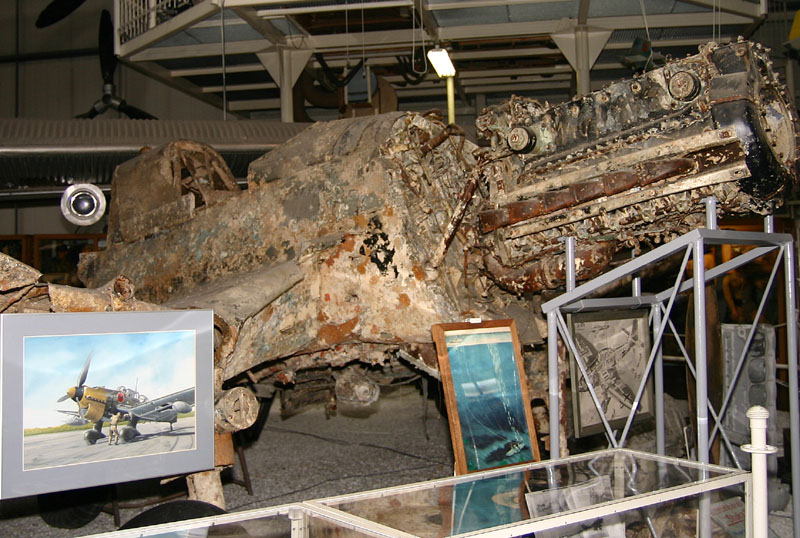 World wide there are only very few of these Stukas (Stuka means Sturzkampfbomber, meaning dive bomber) who survived their WW2 career.The wreck was located 1982 , 60m deep in the mediterranean near the Cap St. Tropez. During 1989 it was partially raised as the tail was left there in 100 m deep water, unable to get to it. The plane was lost during an attack against american supply ships on 16Aug44. Originally it belonged to the 4/StG 77 (eastern front) and was transfered due to it's old technical design, to a training unit at an Ergaenzungsstaffel in Freijus (France). The cockpit canopy was shoved backwards when the plane was found: perhaps the crew had managed to bail out. It seems restorations are on hold. Source: Thomas Genth, Survivors |