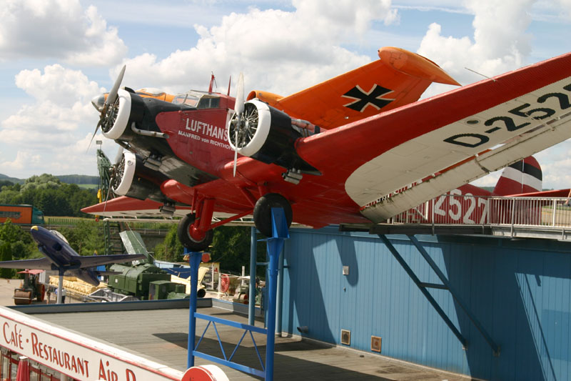 It seems that this Junkers Ju-52 is in fact a license-built Spanish CASA 352L ! Its construction number is supposed to be 100 and it is the former Spanish Air Force T.2B-209. After being retired the aircraft was first used as a bar at Placenia in Spain...It has been repainted in a red colourscheme and registered D-2527 Manfred von Richthofen, to commemmorate the fact that Herrmann Goering (in charge of the Luftwaffe in WW2) used that original aircraft. The Hugo Junker Homepage |