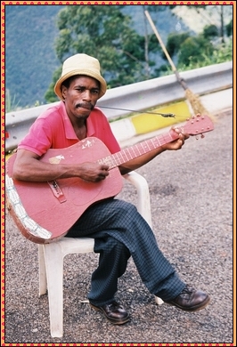 We drove from Pietersburg to Hoedspruit via the Maboegaskloof (kloof = canyon), where the many tea plantations reach as far as the eye can see. The winding road was a very pleasant drive and we could smell the tea, even while driving the car.Further along we stopped to enjoy the view and found this man selling his few products and playing his 3-string guitar to his 2-man crowd... In spite of the many warnings (we followed up on all good and sensible advise) we never felt uneasy and found the less fortunate quite active in their struggle to improve their lifestyle. |