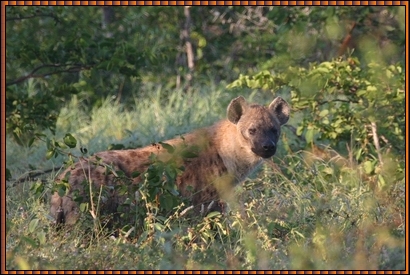 A Spotted Hyena kept an eye on us while it slowly moved away in de bush. Considering how quickly animals manage to vanish from sight in these bushes, it is a wonder we came across some of them at all ! |