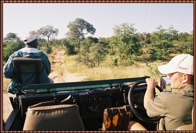This is the best thing... The Timbavati is a private game reserve and lodges lease their area for their business. The prices for staying in these lodges vary quite a bit and I was shocked by some. I choose Gomo Gomo Lodge because it was affordable, but also because it concentrated on the game drives and less on the pampering of guests. And Timbavati Game Reserve, lying next to the Krugerpark, offers the "Big Five" !The game drives are conducted in open landrovers, driving across winding roads through the park, while the Ranger (Joachim a.k.a. "Joggie") at the wheel keeps a sharp eye out for wildlife and offers explanations and tales to the guests seated behind him. The tracker (Oscar is seen on the back) is also in a position to look for tracks on the road we were driving. The sight of these guys to spot animals is uncanny ! Notice the rifle next to the Ranger... |