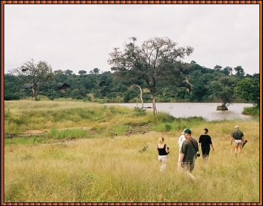 Our only exercise: the Bushwalk. The early morning gamedrive started at 06:00 and was followed by breakfast, around 08:30. Breakfast was followed by a cup of coffee and watching the Nhlaralumi river flow by and animals (antilope, baboons) on the other side. At 10:00 volunteers left with the Ranger (with rifle) for a bushwalk. During the walk he explained tracks, animal droppings and behaviour, answered questions and kept an ever vigilant eye on the surrounding area and tale-telling tracks. After the 45mins walk we were allowed to rest until 14:30 (lunch) and the gamedrive at 16:00 (lasting until 19:30+, with a stop at 18:00 to watch the sunset with a gin-tonic). Dinnertime depended on the time of our arrival (sometimes sightings brought us a long way from the lodge and return was past 20:00) and was enjoyed in the boma, around the campfire. |