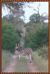 ![]() The zebra we did not see in large herds, something I had expected from my last safari (in Kenya, 20 years ago !), probably also to do with the draught. But while we visited Timbavati, the river had filled and it was expected that many animals would return over the next few months. The Burchell Zebra is a horse-like herbivore and lives in family units of several mares and their offspring. We learned from the Ranger that when a zebra young is born, it will split from the group with its mother so as to able to learn and distinguish its mother's pattern from the other mares. |