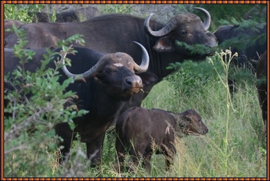 They are non-territorial and roam around in large herds, feeding on grass, trying to remain in the shade of the small trees and bushes. There is a contant feeling of overcrowdedness when 40 of these buffalo's move around between the thick undergrowth. Herds can be as large as hundreds of them.The lion prey on them but the herd affords good security and protection. The Ranger estimated the young in this herd to be about 1 month old. |