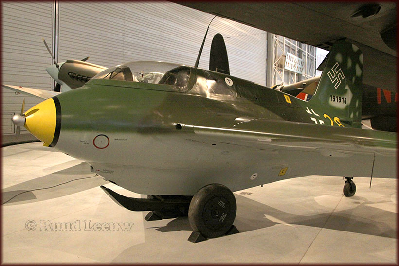 As the only operational rocket-powered fighter of Second World War (first flight: August 1943), the Komet was designed to exceed the performance of conventional aircraft. Originally tested as a glider, the tailless design incorporated a wheeled dolly dropped during takeoff, and a landing skid under the fuselage. The Komet first flew operationally in May 1944. |