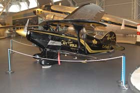 Pitts Specials carry a high profile in the world of sport aviation as they are acknowledged to be one of the world’s leading aerobatic aircraft, winning more competitions than any other type in history. These nimble aircraft incorporate different upper and lower wing sections that provide inverted performance equal to conventional “right side up” flight. This wing design also facilitates outside loops. The original Pitts design dates from the early 1940s and over the years more powerful engines and various aerodynamic modifications have led to several models that are capable of unlimited aerobatics carrying two persons. The Museum’s example is the last surviving aircraft from the famous Carling Red Cap civilian aerobatic team of the 1970s. It has been flown on a regular basis since and over the years has been modified to incorporate changes made to later models. It flew as a member of successor aerobatic teams such as the Canadian Reds and the Ray-Ban Golds. Throughout its operational career, its spectacular performances have inspired many young Canadians to become involved in aviation. Its present finish and markings reflect its last years as a member of the Ray-Ban Golds. |