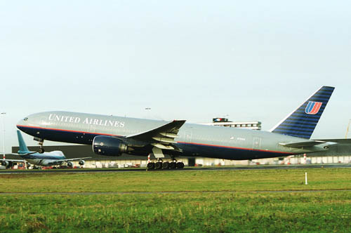 My photo here shows Boeing 777-222(ET) N772UA (c/n26930/5) on take off from Amsterdam on 14Jan05. Those mighty Pratt and Whitney PW4077 engines certainly produce an impressive thrust.